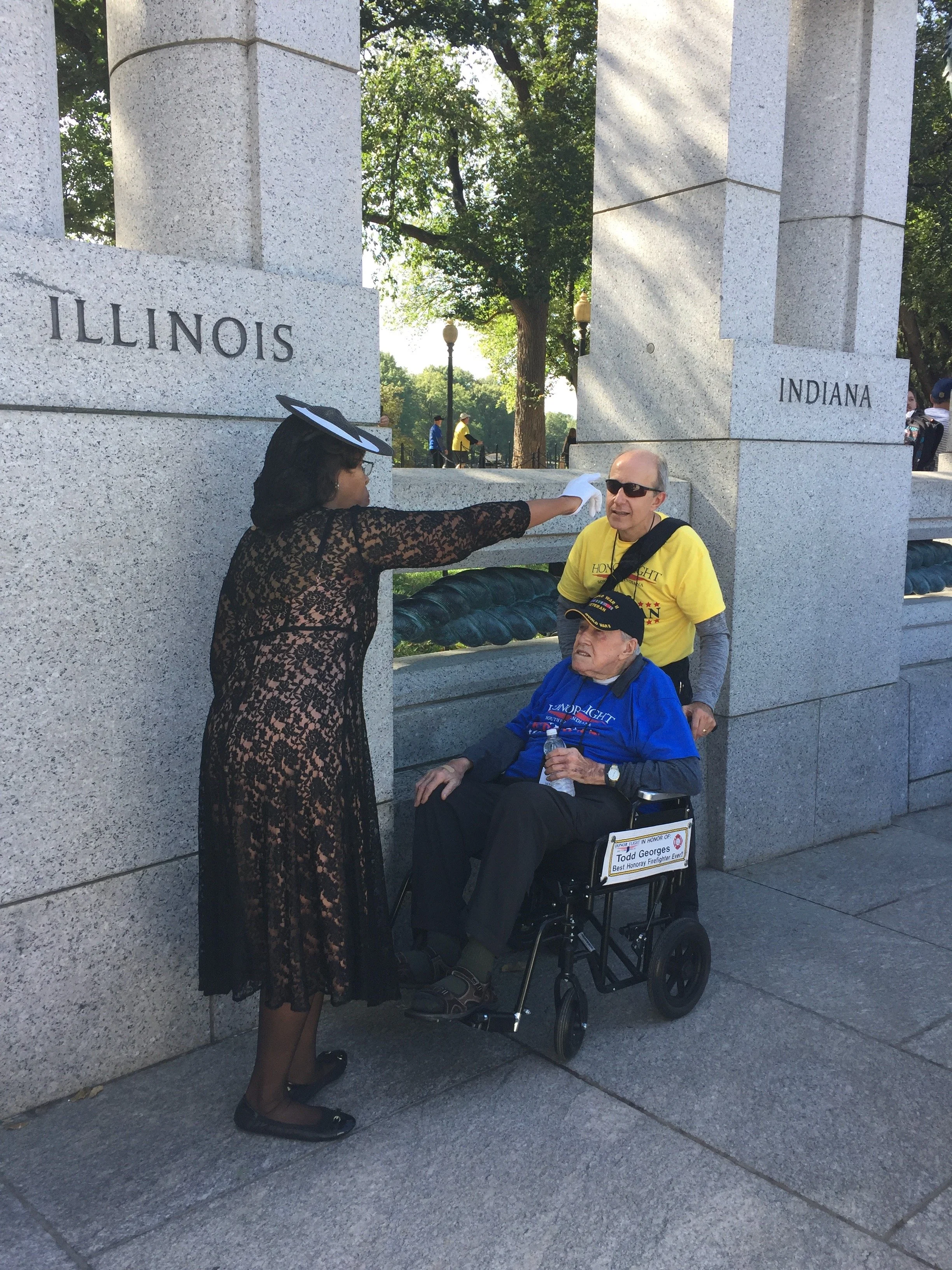 Karima Hurt (left), dressed in World War II period clothing as part of the National Park Service’s Living History program, gestures to members of the Honor Flight Network’s southern Indiana hub at the World War II Memorial in Washington, D.C., on Saturday, Oct. 21, 2017. (LINDSEY LEAKE/AMERICAN UNIVERSITY)